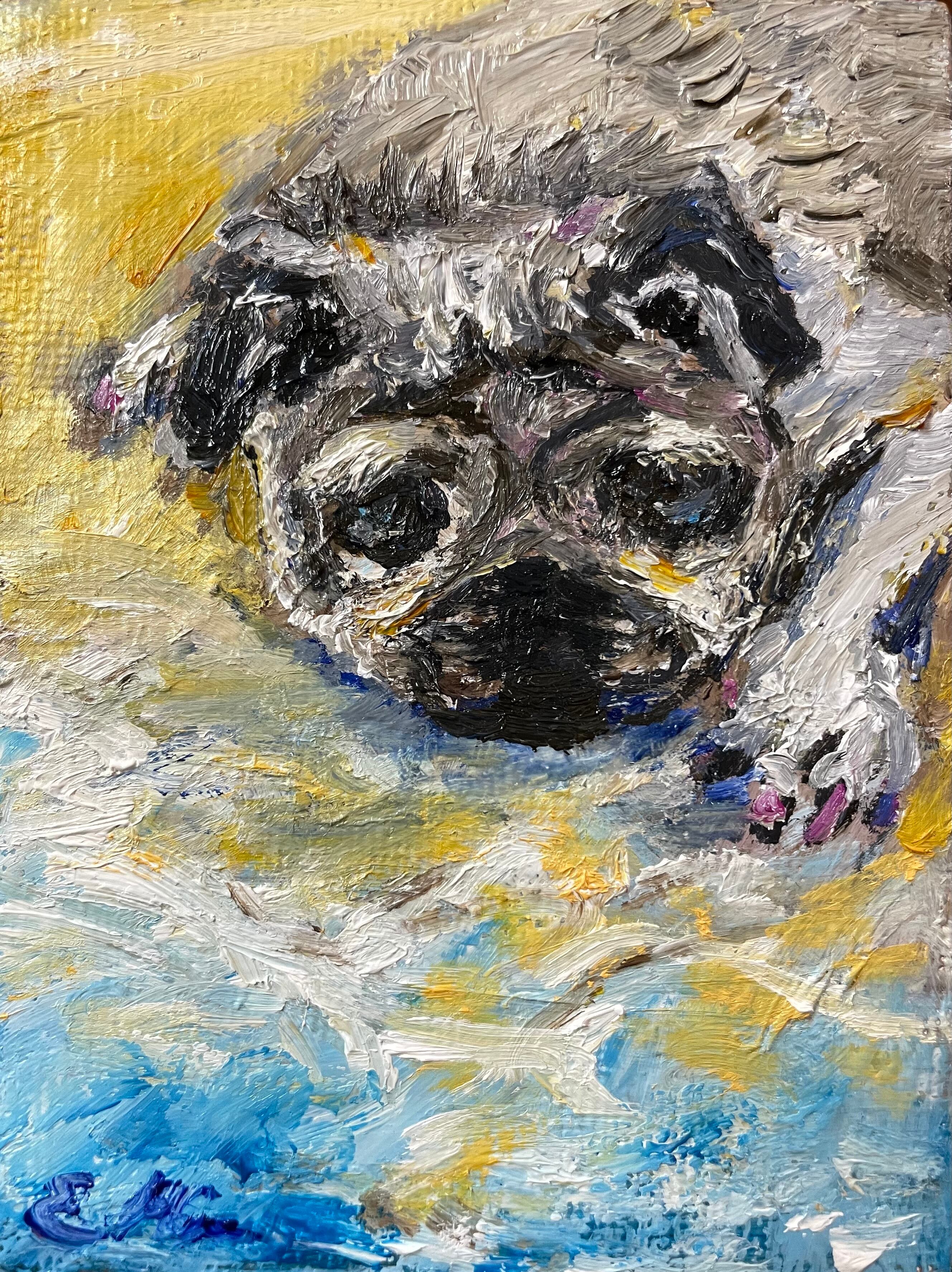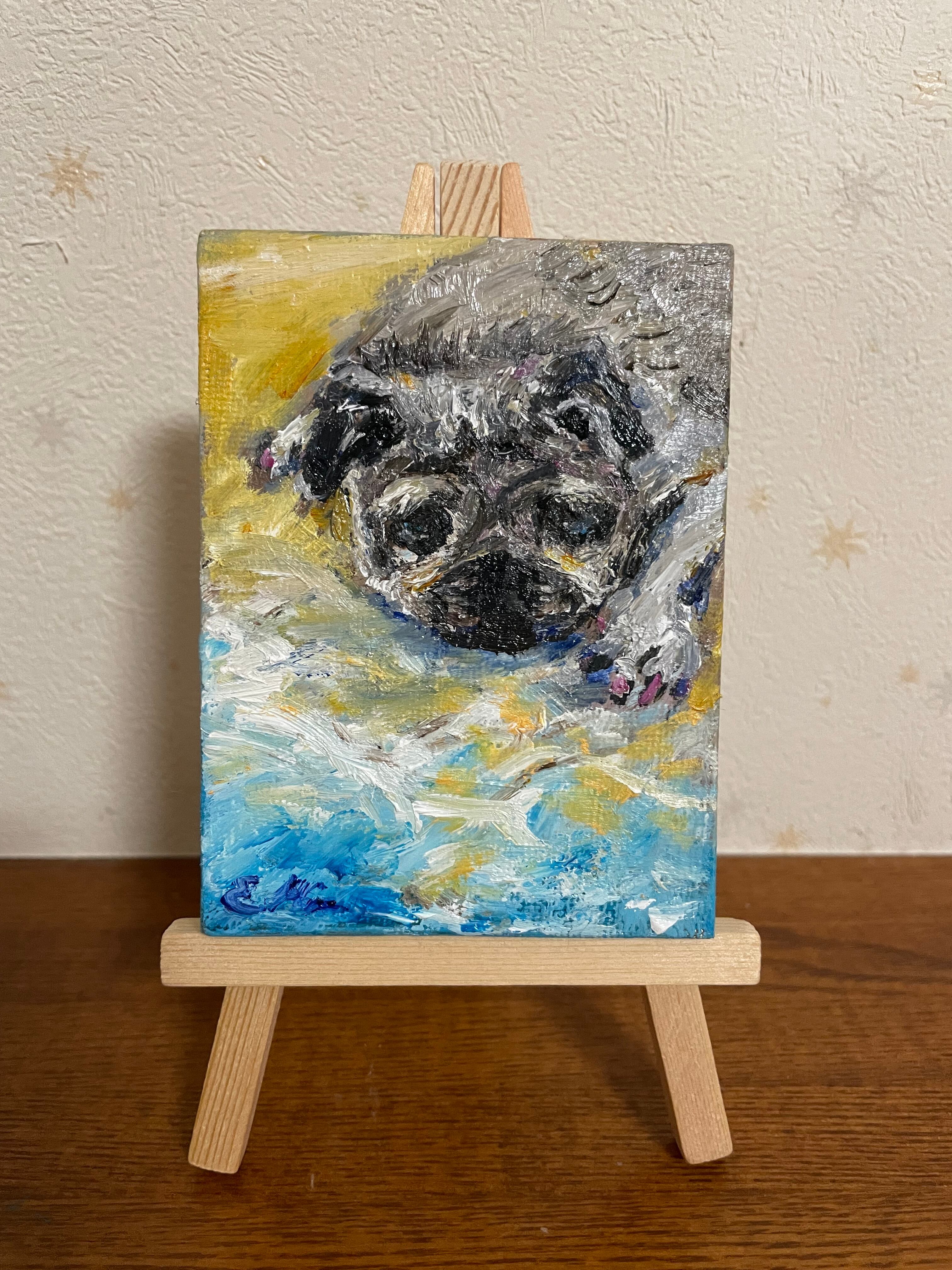 プチアート『波打ち際のパグ』油絵は、愛らしいパグが波打ち際でのんびりと過ごしている姿を描いた、一瞬の癒しをもたらす作品です。この小さな油絵は、キャンバスサイズが10×7cmとなっており、お部屋のインテリアとしてぴったりです。